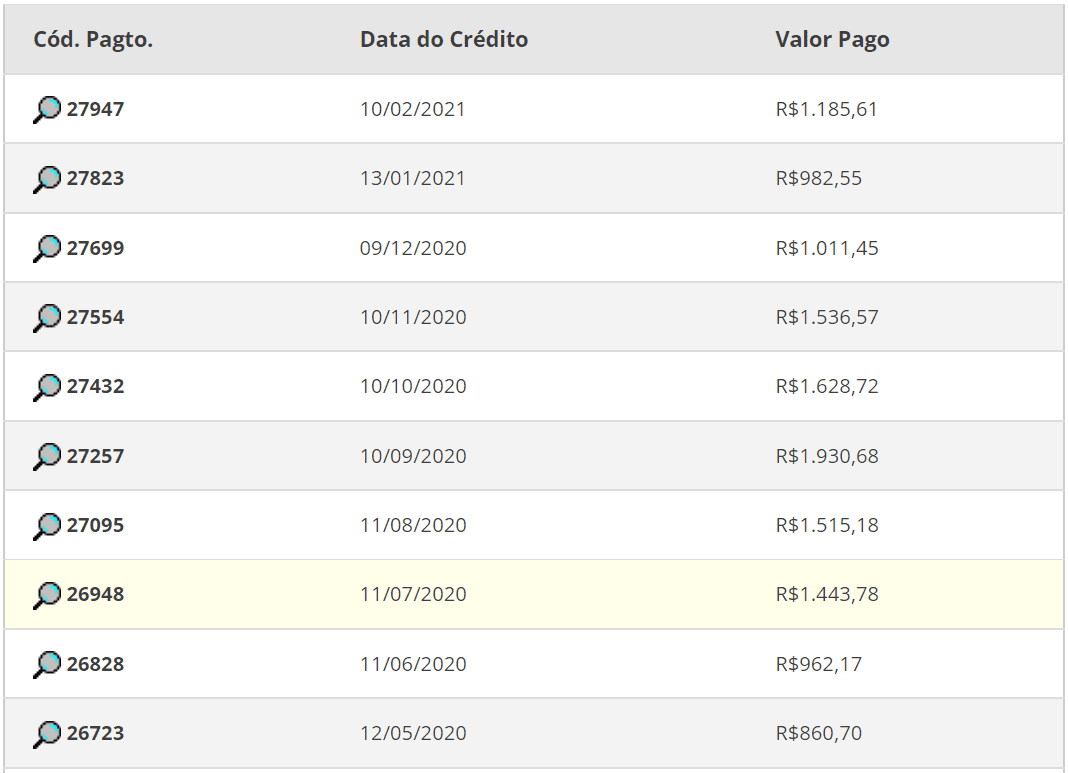 Sequência de pagamentos recebidos de uma loja online de bijuterias e folheados.